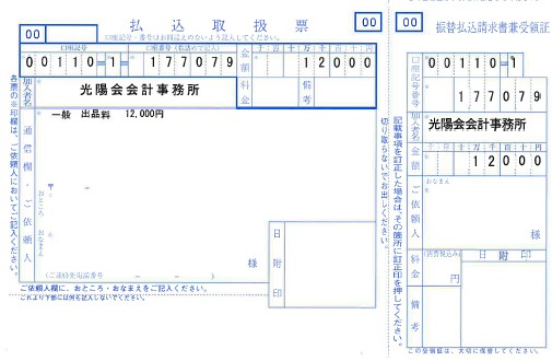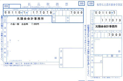 ゆうちょ銀行口座記号番号: 00110-1-177079、 加入者名: 光陽会会計事務所